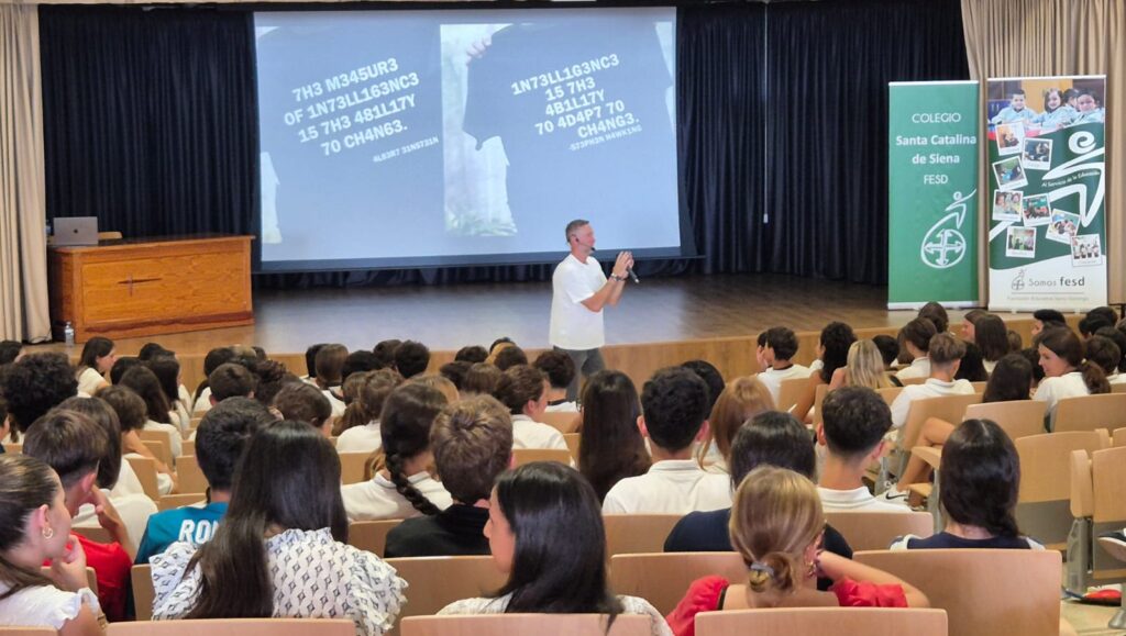 El acto ha contado con la participación de más de 500 alumnos de 2º, 3º y 4º de la ESO, así como de su equipo docente, en una sesión conducida por Pedro García Aguado, embajador del Proyecto FES. Durante su intervención, García Aguado ha animado a los estudiantes a reflexionar sobre la importancia de “tomar decisiones conscientes y no dejar que la tecnología decida por nosotros”, recordando que “el uso responsable de internet y del ocio digital comienza por conocerse a uno mismo y saber poner límites”.