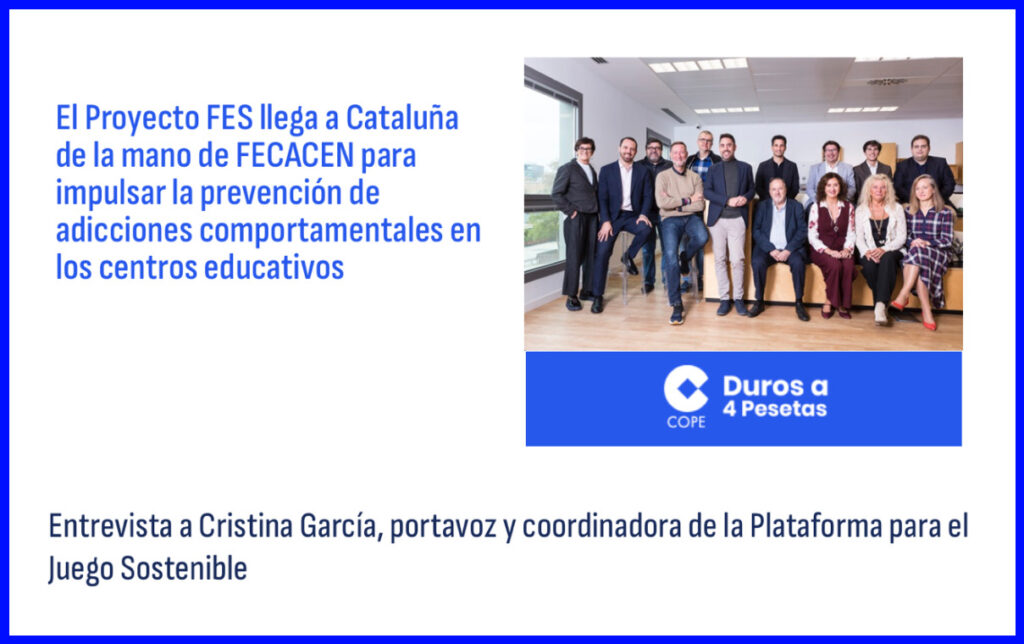 Barcelona acogió recientemente la presentación del Proyecto FES, una iniciativa de prevención temprana de adicciones comportamentales y uso problemático de internet en adolescentes. Con este motivo, el programa de radio “Duros a 4 Pesetas” de COPE entrevistó a Cristina García, portavoz y coordinadora de la Plataforma para el Juego Sostenible, entidad impulsora del proyecto. El acto contó además con la colaboración de FECACEN, entidad clave en su llegada al territorio catalán.
