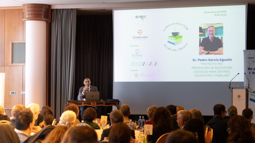 Bajo el paraguas de la Asociación de Centros de Enseñanza de las Islas Baleares (CECEIB – ACENEB), con la colaboración de GRUPO ANAYA y EUREST FUNDACIÓN, ha tenido lugar una nueva edición del evento «Desayunos de la CECEIB: Un cafè amb l’Educació», que bajo el título Proyecto FES: Prevención de adicciones digitales para centros educativos y familias, ha contado con una ponencia a cargo del divulgador Pedro García Aguado.
